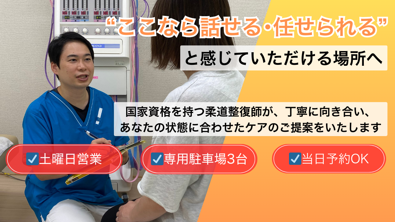 長引く腰のつらさや体の不調に寄り添う、佐賀市の整骨院です。無理のない施術でじっくり向き合います。